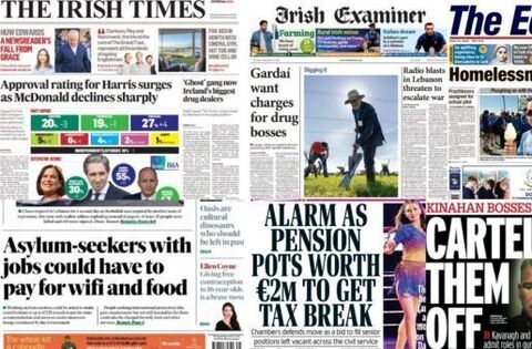 The Irish Times lead with the results of their poll, which shows a jump in support for Simon Harris and Fine Gael, while Sinn Féin continue to drop and the approval for Mary Lou McDonald continues to decrease.