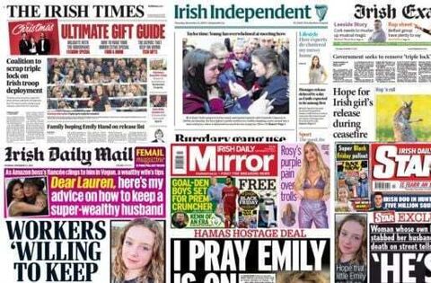 The front pages on Thursday are primarily focused on the hope that Irish-Israeli girl Emily Hand will be included in the first group of hostages released in Gaza.