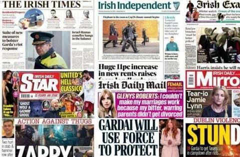 The Irish Times and the Irish Daily Mail focus on the Garda's enhanced riot response, with gardaí to be equipped with Tasers, water cannons and stronger pepper spray to avoid a repeat of scenes in Dublin last week.