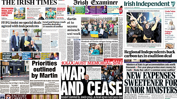 The Programme for Government and the ceasefire agreed in Gaza makes the front pages of Thursday's papers.