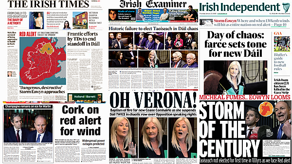 Chaos on the return of the Dáil and the latest on Strom Éowyn dominate the front pages of Thursday's papers.