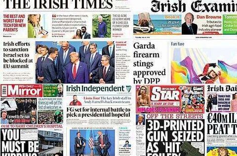 The Irish Times lead with Irish efforts to sanction Israel likely to be blocked at Thursday's EU summit, Tusla hiring security guards to restrain children during violent episodes, and large-scale illegal peat extraction still taking place.