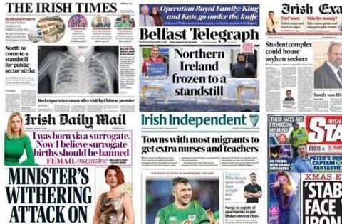 The Irish Times and Belfast Telegraph lead with the Northern Ireland public sector strikes, with nurses, teachers and transport workers among the 170,000 people taking action over pay.