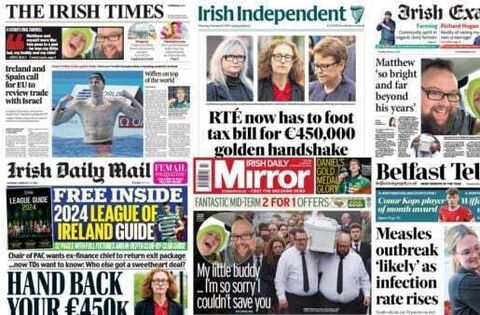 The Irish Independent and Irish Daily Mail lead with the revelation during an Oireachtas committee hearing that RTÉ's former chief financial officer was given an exit package worth €450,000.
