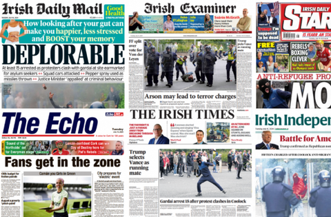 The Irish Independent describes Monday's scenes as a 'Day of mayhem', while the Irish Daily Mail goes with one word: 'Deplorable'.