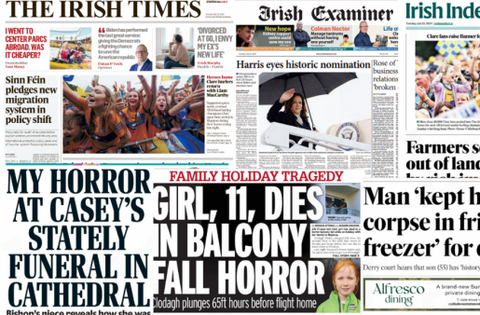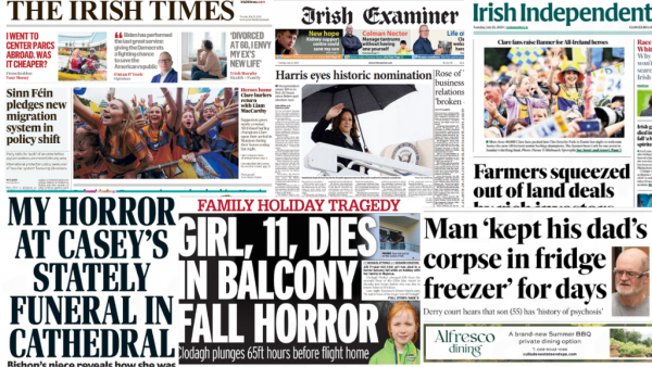 The Irish Examiner leads with a picture of Kamala Harris, who is set to become the Democrat nominee for the US Presidential election.