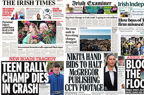 The Irish Times leads with talks to form a Government are approaching the final stages. The front page also reveals there has been a fall in personal injury claims.