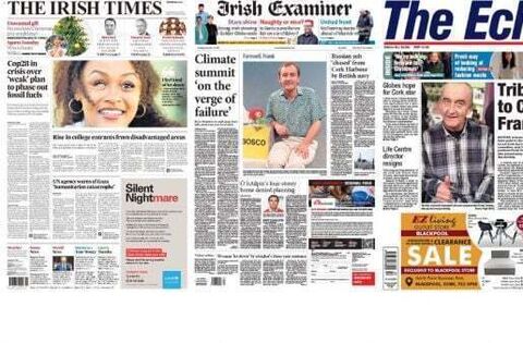 The Irish Times and Irish Examiner both report opposition to a draft decision paper at Cop28 hardened overnight as a large number of countries dismissed it as being weak with an absence of clear commitment to phase out fossil fuels.