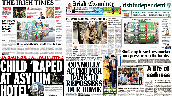 The Irish Examiner leads with Catherine Connolly claiming Fine Gael is terrified of her, as the attacks from Heather Humphreys on Ms Connolly's time as a barrister continue.