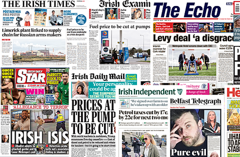 The Irish Examiner also covers the €250m package that is set to come into effect tonight, cutting prices at the pumps until the end of May. An investigation is underway into the activists group of jihadists linked to a man who stabbed a garda and carried out an arson attack on Conor McGregor's pub. And a Cork teenager who has developed a web-based maritime surveillance platform to predict the movements of ships that evade conventional tracking systems is being tipped for a national student award.