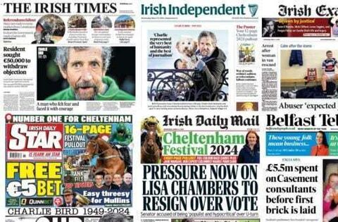 The Irish Daily Mirror and Irish Daily Star lead with tributes to Charlie Bird from the Stardust families.