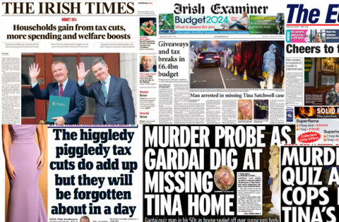 The Irish Examiner also focusses on the tax breaks that were announced in the budget. The front page also leads with a man who was arrested over the disappearance of Tina Satchwell.