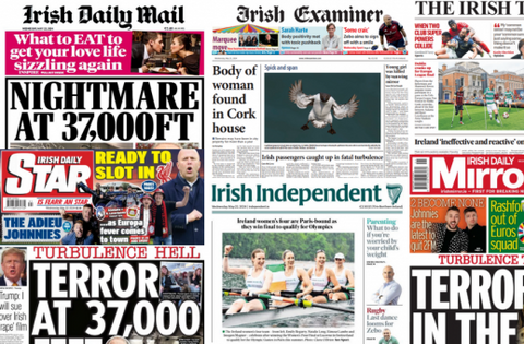 And the Irish Daily Mail, Irish Daily Mirror and Irish Daily Star each lead with the story on a flight from London to Singapore, which encountered severe turbulence, resulting in the death of a man aged in his 70s.