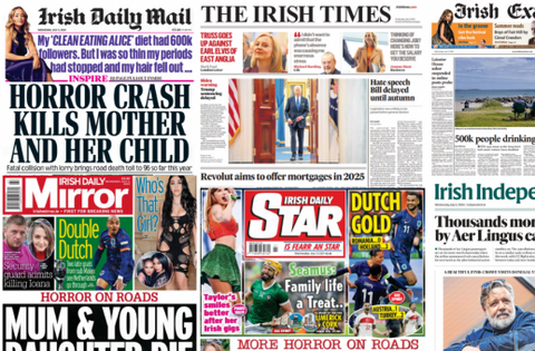 Meanwhile, the Irish Daily Mail, Irish Daily Mirror and Irish Daily Star all lead with a fatal collision in Co Mayo on Tuesday, in which a woman and girl were killed.