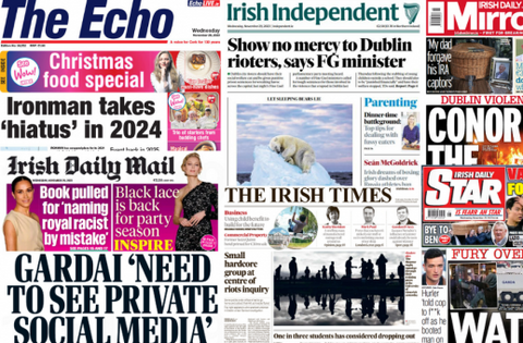 Finally, both the Irish Daily Mirror and Irish Daily Star carry images of Conor McGregor after he was mentioned in the Dáil on Tuesday in relation to his posts on social media during last week's riots in Dublin.