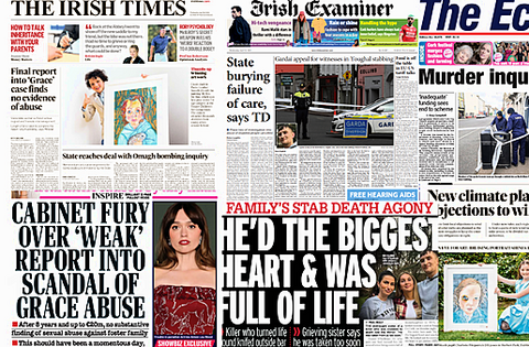 The findings of the Grace report and the fatal stabbing of a man in Cork make the headlines of Wednesday's papers.