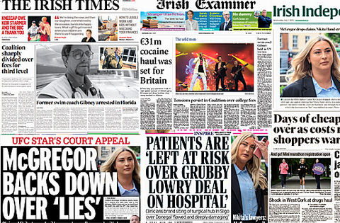 Both the Irish Daily Mirror and the Irish Daily Star both lead with Conor McGregor's appeal against his rape conviction, as he dropped a bid to introduce fresh evidence.