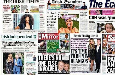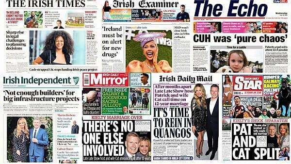 Late Late Show host Patrick Kielty and British TV star Cat Deeley's separation and the stabbing of a garda in Dublin city centre dominate the headlines of Irish newspapers on Wednesday.