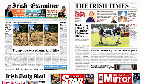 A struggle in Garda recruitment and the threat of additional US pharmaceutical tariffs are among the stories that feature on Wednesday's front pages.