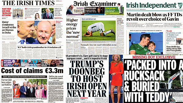 Israel's strike on Qatar and Jim Gavin picked to run for president make the front pages of Wednesday's front pages.