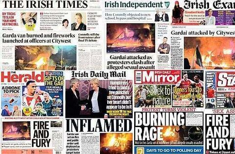 Gardaí being attacked with missiles and fireworks at violent protests outside a Dublin hotel used to house asylum seekers dominate Irish front pages on Wednesday.