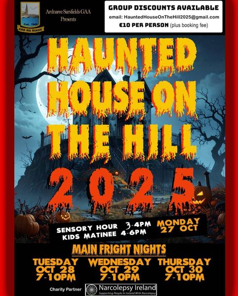 The previous two years of Haunted House on the Hill were a huge success, with the club donating a share of the proceeds to Autism Friendly Town and Pieta House. This year, a donation will be made to Narcolepsy Ireland from the proceeds raised.