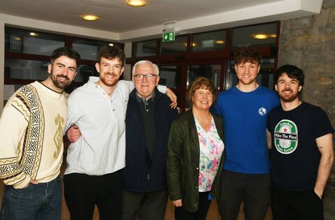 Amble played Ballina Arts Centre earlier this year, from left: Robbie Cunningham, Oisin McCaffrey (band members), Monsignor Kevin Loftus, Bernie McCaffrey, Rory McCaffrey, from Enniscrone, and Ross McNerney (band member). Picture: John O'Grady