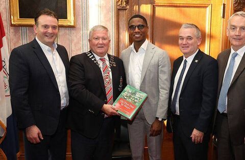 Cllr Michael Loftus, Cathaoirleach Mayo County Council, presents the Mayor of Cleveland, Justin Bibb, with a copy of On This Day In Mayo during his recent visit to Cleveland in Ohio. Also included are Cllr Cyril Burke, Cllr Brendan Mulroy and Austin Vaughan, County Librarian.