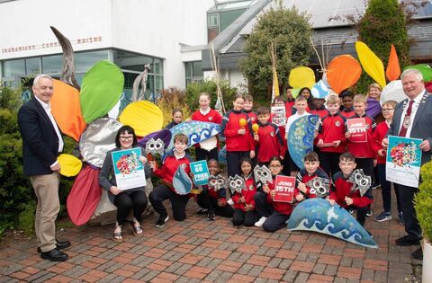 Pupils from Castlebar Primary School with Cllr Michael Loftus, Cathaoirleach of Mayo County Council; Mayo County Librarian Austin Vaughan and library and arts office staff at the launch of Cruinniú na nÓg 2024, which takes place on June 15th, 2024. Pictures: Alison Laredo