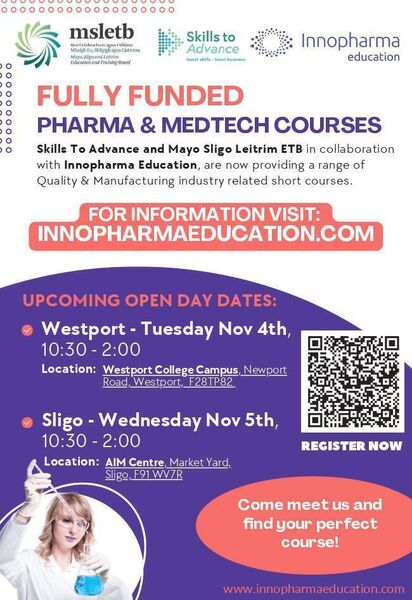 There will be two drop-in events taking place next week in Westport on Tuesday November 4th and in Sligo on Wednesday November 5th, where anyone interested in studying on one of the programmes can meet with the Innopharma team to find out more about the courses and ask any questions they have about course content, accreditation, eligibility and the application process.