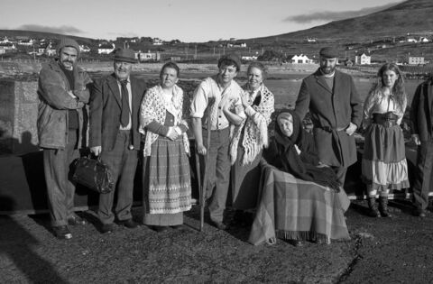 Dooega Drama Group's cast of 'The Cripple of Inishmaan', which will be performed in Achill this Friday and also on December 27 and 28. From left: Éoin Burke (Babbybobby Bennett), Micheál McNamara (Doctor McSharry), Aisling Masterson (Eileen Osbourne), Ethan McNea ('Cripple' Billy), Caroline Masterson (Kate Osbourne), Siobhán Molloy (Mammy McDougal), Toirlach Dever (Johnnypateenmike), Áine Mangan ('Slippy' Helen), Éoin Murphy (Bartley McCormick). Picture: Hiro Masuda