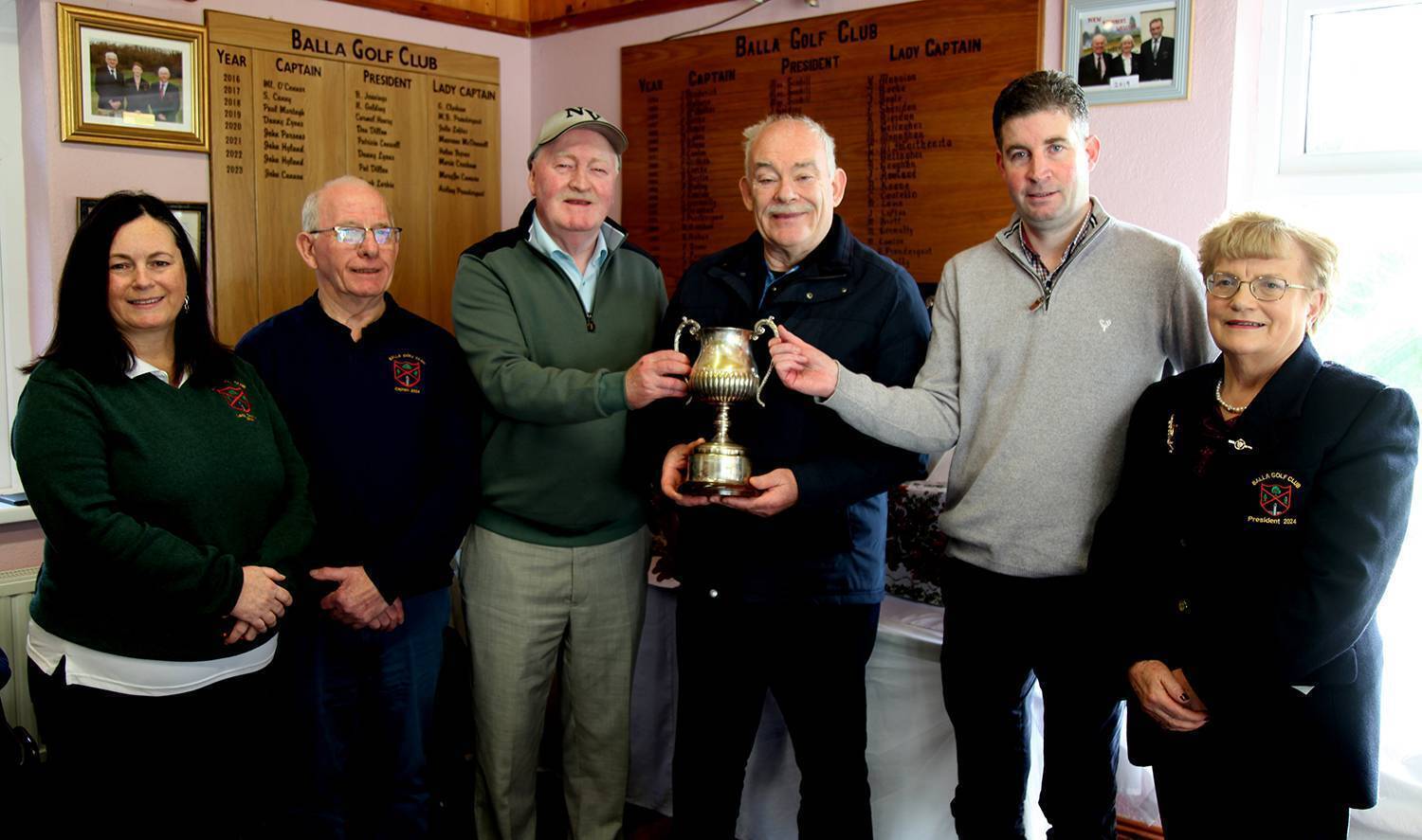 Winners of the Joe O'Brien Cup at Balla Golf Club were John Hyland and Ronan Mahon, who are pictured receiving the Cup from Joe O'Brien (sponsor). Also pictured are Club President Mary Jo Cannon, Lady Captain Caroline Bourke and Captain John Walsh. Picture: Trish Forde
