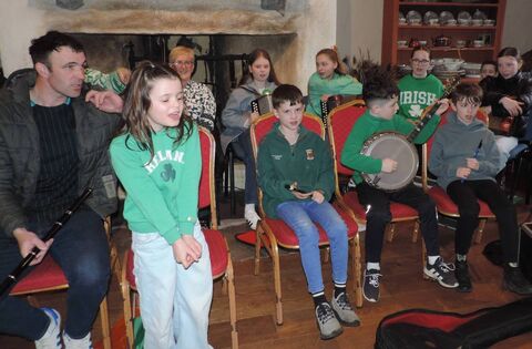 Children from Kilmovee NS taking part in the Cois Tine St Patrick's Day session.