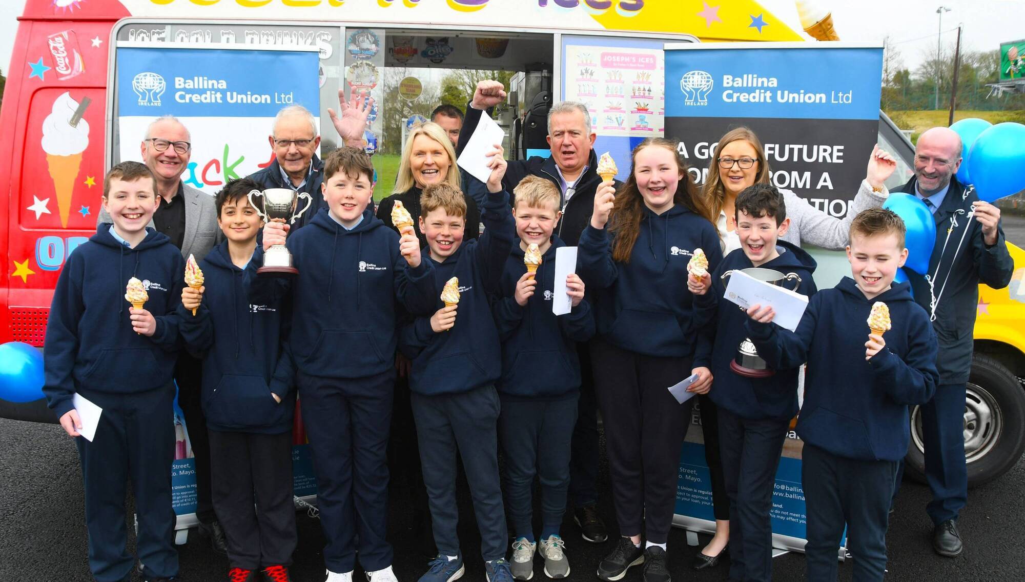 The Under-11 and Under-13 teams from The Quay National School in Ballina were placed first and runners-up respectively in the All-Ireland Credit Union Schools Quiz Final in Dublin. Ballina Credit Union (BCU) marked the outstanding achievement by the winning pupils with an event in the school last week. Adding to the excitement of the day was an ice cream van in the school grounds. Back row, from left: David Dwane (Director, BCU), Pat Farrell, BCU volunteer), Valerie Moran (Risk and Compliance Manager, BCU), John Carroll (Director, BCU), Chloe Nealon (Team Leader, BCU) and Mark Winter (Chairperson, BCU). Front row are the top young quizzers: Noah Gallagher, Rowan Harrison, David Baynes, Michael Duffy, Iarla Hannon, Aoife Hillery, Gareth Doyle and Cian Gillespie. Picture: John O'Grady