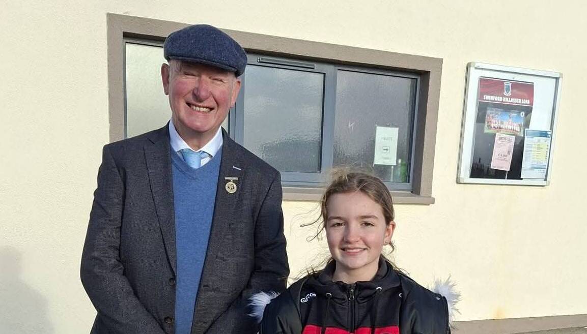 Ceola Quinn, Swinford who sang the National Anthem at the AIB Connacht LGFA Junior Club Championship Final in Swinford Amenity Park on Saturday November 1, pictured with Connacht LGFA President Brendan Cregg.
