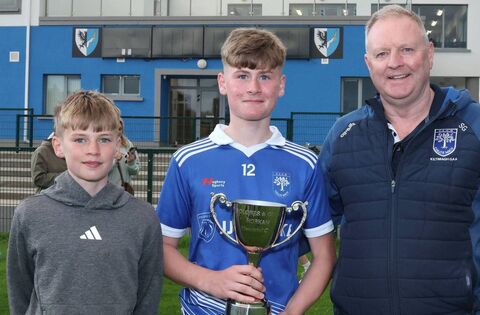 Danny, Conor and Shane Gilmartin with the Dolores and Colm Horkan Memorial Cup after Kiltimagh's win against Aghamore in the East Mayo U16 'B' football championship final at the Connacht GAA Centre of Excellence. Picture: Michael Donnelly