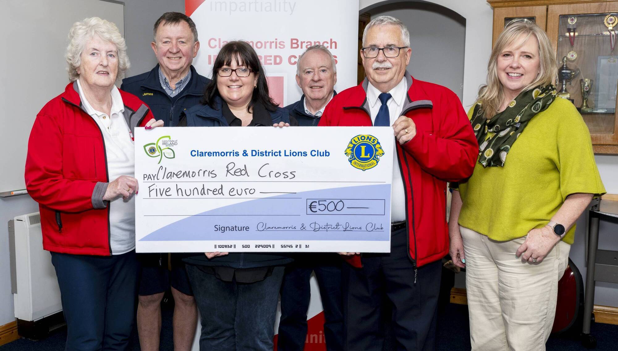 Claremorris and District Lions Club recently made a presentation of €500 to the local branch of the Red Cross. Back row, from left: James Preston and Michael Clarke of Claremorris and District Lions Club. Front row: Eileen Connolly (Red Cross), Melissa Walsh (Lions), Ger McCallig (Red Cross) and Catherine Cosgrove (Lions). Picture: John Corless