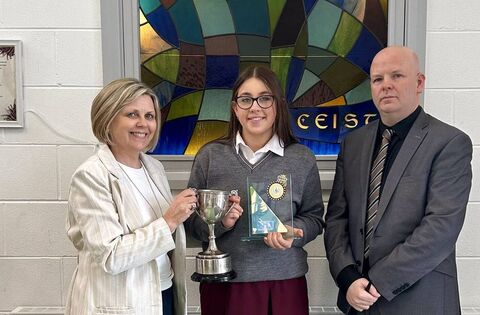 Congratulations to Leah Naughton in Transition Year who won the Ray Leonard Award for musical performance at Mount St Michael Secondary School. Leah is photographed with TY Year Head Ms Thérèse Moran and principal Ciarán Ryan.