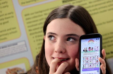 Alicia Ward, a student from Mount St Michael Secondary School, Claremorris, showcasing her app 'Sign Tales' at the Irish charity Teen-Turn's final showcase event held in IBM Ireland in partnership with SciFest. Picture: Robbie Reynolds
