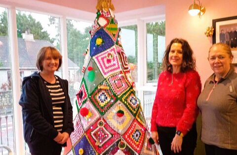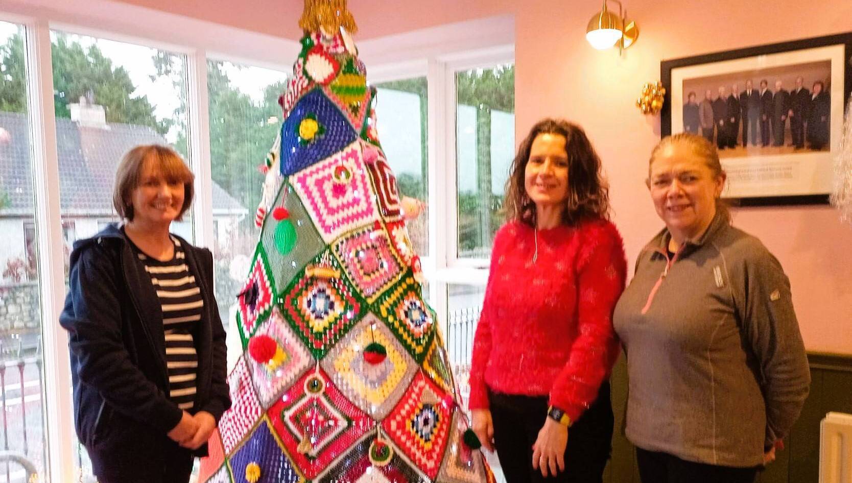 Pictured admiring the beautiful crochet Christmas tree on display in Knockmore/Rathduff Resource Centre which was created by the local knitters group are staff members Caroline, Anne (manager) and Paula.