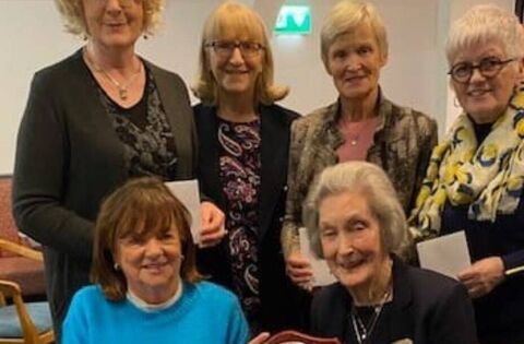 The Freeman Trophy Competition was held over 2 nights on February 14 and 21. There was a great turnout on both nights with 30 members participating, 71/2 tables with the overall winner being Francis Walkin. Front Row; Francis Walkin winner being presented with her prize by Anne Freeman. Back Row: Agnes Moran 2nd, Christine Kirby (President), Helena Moran 3rd, and Mairin Wade 4th.