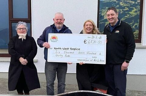TP McDonnell, Sons of Rest Golf Society, Enniscrone Golf Club presenting a cheque of €6730 to Mary Horkan, North West Hospice. The cheque was the proceeds of a raffle held at Christmas. Also included are Majella Walker, Occasions Jewellry (sponsor) and Michael Moylett, Captain Enniscrone Golf Club.