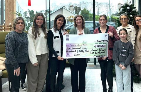A massive thank you to these fantastic ladies from Zone Fitness who recently completed the Sea to Summit Challenge in support of Cancer Care West services, raising a €10,555 in the process. Pictured are (l-r): Michelle McGuire, Jemma McGuire, Sandra Ginnelly, Orla Cunniffe (Cancer Care West), Sinead Doherty, Sharon Sweeney, Sinead Cosgrove and Eileen Maloney (standing in for her mum Louise Maloney). Missing from photo is Abby McGuire.