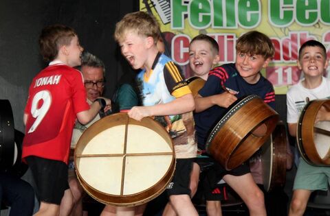 Bodhrán class participants having fun at Féile Ceol na Locha in Tourmakeady. Picture: Trish Forde
