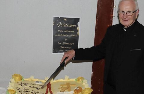 Fr Padraig Costello prepares to cut a cake specially prepared to mark the 50th anniversary of his ordination as a priest. A Mass at St Michael's Church in celebration of his Golden Jubilee was followed by a reception in Foxford Leisure Centre. Picture: Louis McNulty
