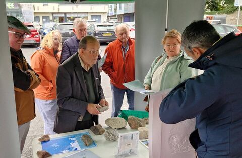 Geologist Benjamin Thébaudeau in full explanation mode with some of the Ballinrobe locals at Joyce Country and Western Lakes Geopark’s ‘road show’ which was held in SuperValu carpark in the town, during Heritage Week August 2024.