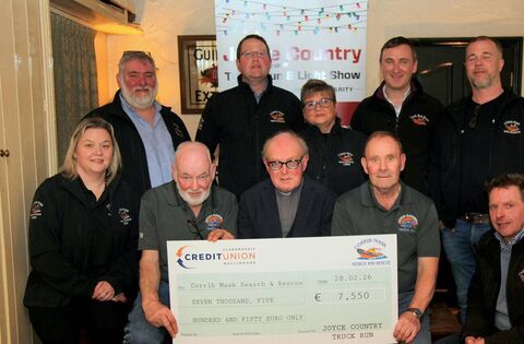 The Joyce Country Truck Run 2025 organisers are pictured presenting €7,550, proceeds raised by the Truck Run to members of The Corrib Mask Search and Rescue, at Keanes of Maam:Left to right: Front:Michelle O'Hare,Paddy Rock(Joyce Country Truck Run), Fr Kieran Burke PP, Ray McHugh (Joyce Country Truck Run), Alan Daly. Back: Aidan McAleenan, Michael Gibbons (Chairman), Maeve McAleenan, Sean Burke and Shane Rogan. Pic:Trish Forde.