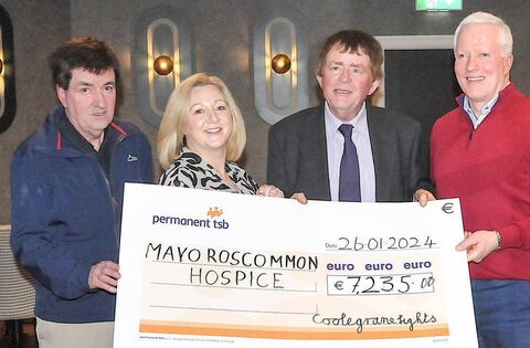 Kevin Hughes (second from right) presenting a cheque for €7,235 to Marie McGuinness from the fundraising department of Mayo Roscommon Hospice Foundation. The money is the proceeds from the Christmas Lights display held at Kevin's home in Coolegrane, Foxford. Also included are Brendan Hughes, Coolegrane Lights and Frank Mulvihill, board member of Mayo Roscommon Hospice Foundation. Picture: Louis McNulty