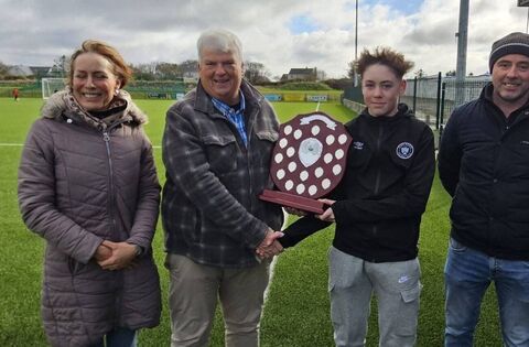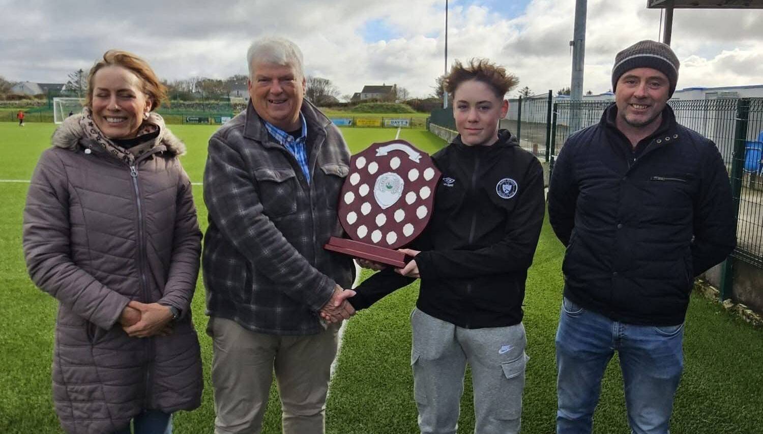 Ryan Tuffy, Kilglass Enniscrone Utd FC player was presented with the Paul McManus 2024/25 season 'Young Player of the Year Award' by Tom McManus. Also included are Ryan's parents Pamela and Jude.