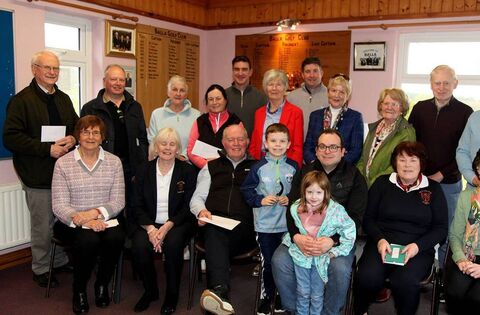 Pictured at Balla Golf Club were the winners of Roche's Centra and club-sponsored Stableford competitions, and the drive-in scramble sponsored by Albany, Castlebar. Front row, from left: Julie Loftus; Club President Maureen McDonnell; Club Captain Danny Lyons; Darragh, Chole and Alan McHugh, who achieved a hole-in-one, Lady Captain Nora Heraty, Mary B Prendergast. Back row: Gus Heraty, Billy O'Donnell, Carmel Kilgallon, Caroline Bourke, Danny Higgins, Carmel Henry, Ronan Mahon (Albany, Castlebar), Kitty O'Connor, Mary Conlon, Matt Leonard, John Cannon. Picture: Trish Forde
